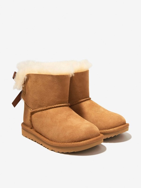 UGG Girls Mini Bailey Bow II Boots in brown bring a plush look to a classic ankle-boot shape. The brown finish gives a clean, understated appearance, while the Mini Bailey Bow II name signals the signature bow detail associated with this style. A simple option for everyday wear, this pair sits neatly in a young wardrobe as a go-to boot for cooler days.