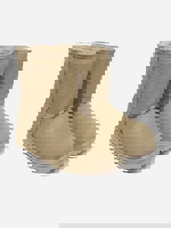 UGG Kids Classic II Boots in beige bring together upcycled wool and twinface sheepskin uppers with overlock stitch detailing along the seams. Inside, a 17mm sheepskin lining sits alongside a foam footbed for added underfoot cushioning. A suede heel counter and textile binding made from 100% recycled polyester fibres complete the upper, finished with a woven heel label carrying the UGG logo.
