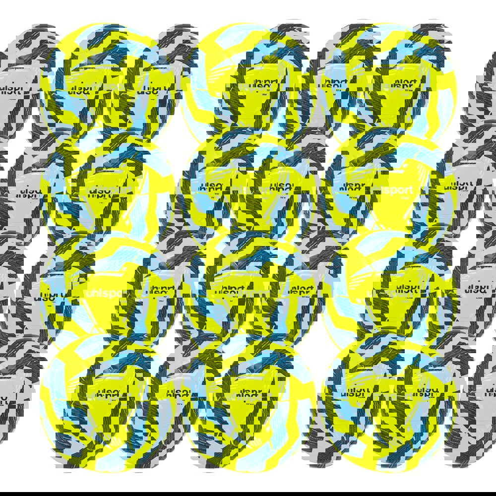 This pack of 12 x Uhlsport team training footballs is ideal for both team training and for individual soccer skill practice. This multi pack features 12 x size 4 footballs in a fluorescent yellow / blue / cyan colour design and are perfect for schools, clubs and teams. These balls are manufactured using a durable soft TPU material and boast a high rebound butyl bladder which offers optimum air retention and game play characteristics. The balls also have 32 machine-stitched panels.