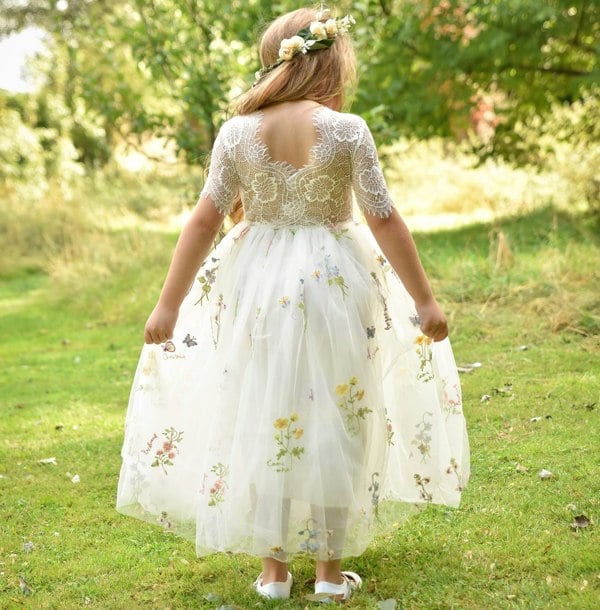 The Enchanted Dress in Ivory Cream features a delicate off-white floral lace bodice, perfectly paired with a soft, embroidered ivory tulle skirt. The gentle cream tone creates a timeless and elegant look, making this the perfect ivory flower girl dress for weddings and other cherished occasions.