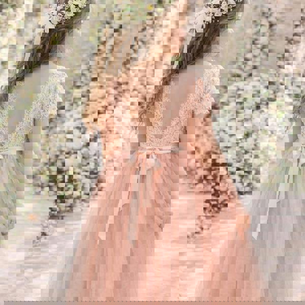 Our enchanting flutter sleeve, full length, tulle and lace flower girl dress, is made with a delicate floral patterned coral lace bodice, with matching coral tulle skirt.