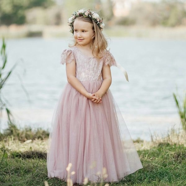 Our enchanting Lace Cap Sleeve, Full-Length Tulle and Lace Flower Girl Dress features a delicate floral-patterned dusty rose pink lace bodice paired with a matching tulle skirt. The V-shaped back with unfinished lace adds just the right touch of vintage charm. The lace bodice is baby soft with a slight stretch, ensuring comfort and elegance.