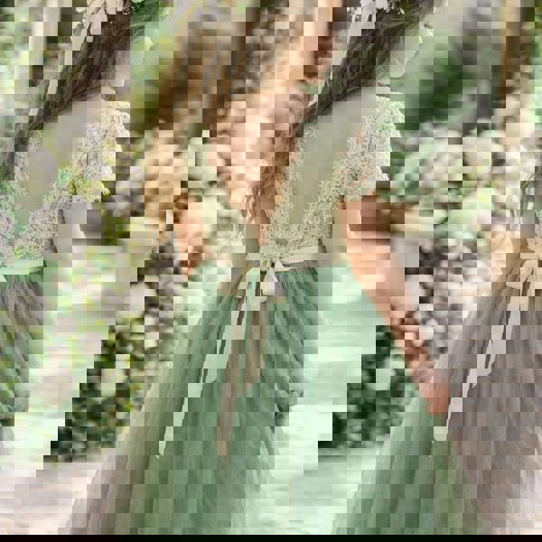 Our enchanting flutter sleeve, full length, tulle and lace flower girl occasion dress, is made with a delicate floral patterned fern green lace bodice, with matching fern green tulle skirt.