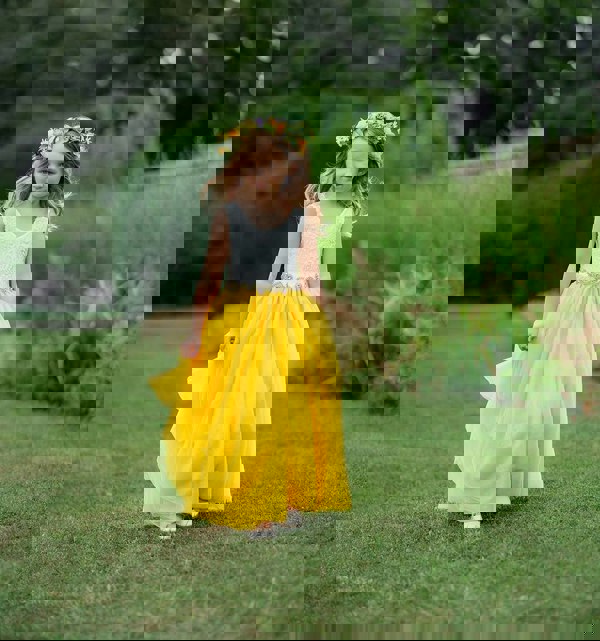 The upper bodice is made with the softest lined off-white quality lace. The vibrant yellow coloured tulle skirt hangs as a fully layered long length skirt that falls around the ankle depending on the height of the child.