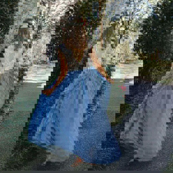 This is matched perfectly with a smoky dusty blue layered full length tulle skirt.