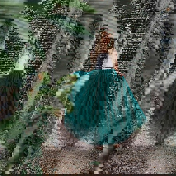 This is matched perfectly with a rich deep green layered full length tulle skirt.