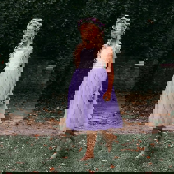 The softest lined white quality lace with a sleeveless bodice. Matched perfectly with a lilac straight layered knee/ tea length tulle skirt. (*Length finish depends on height of the child). The skirt is nipped in along the waist to create a fuller look.