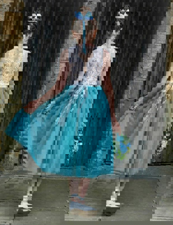 The softest lined white quality lace with a sleeveless bodice. Matched perfectly with a Teal tulle layered knee/ tea length skirt. (*Length finish depends on height of the child). The skirt is nipped in along the waist to create a fuller look.