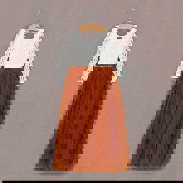 The burnt orange coloured tulle skirt hangs as a full layered long length skirt that falls around the ankle depending on the height of the child.