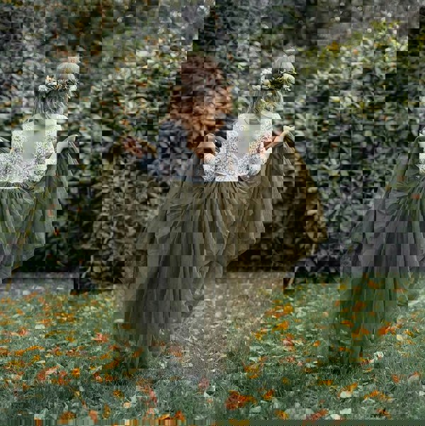 This is matched perfectly with a rich Olive Green straight layered full length tulle skirt.