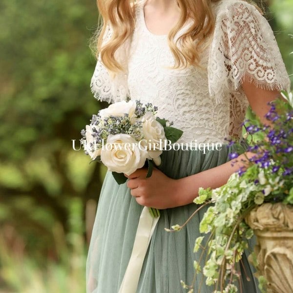 Our enchanting flutter sleeve, full length, tulle and lace flower girl dress, is made with a delicate off white lace bodice and choice of many fully lined, tulle colours for the skirting. This is the sage green tulle dress option.