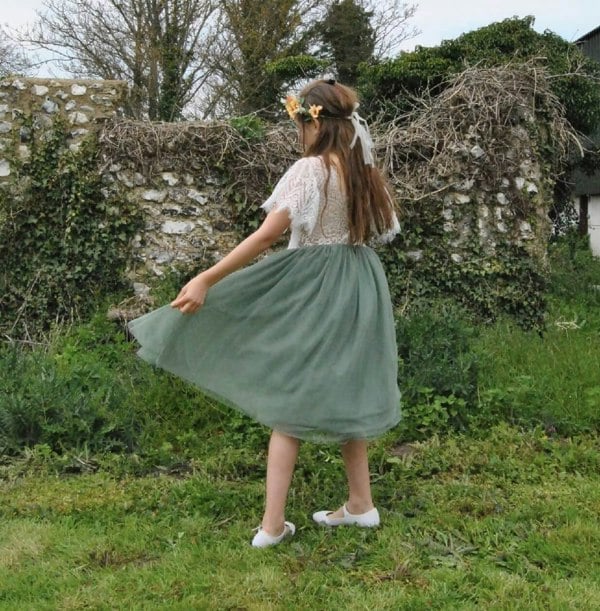This is matched perfectly with a sage green straight layered knee/ tea length tulle skirt. (*Length finish depends on height of the child). The skirt is nipped in along the waist to create a fuller look.