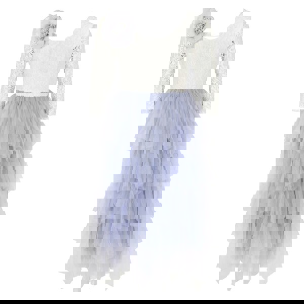 The upper bodice features 3/4 sleeves made with the softest white quality lace. Chest lined. This is matched perfectly with the fullest silver blue toned layered tulle skirt. This quality really do puff out (*Please beware as some imitations fall flat when worn).