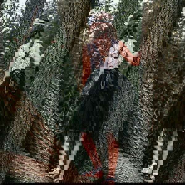 The white upper bodice, is made with the softest white quality lace. Chest lined and featuring a pretty lace and pearl applique. This is matched perfectly with the fullest layered jet black tulle tutu skirt.