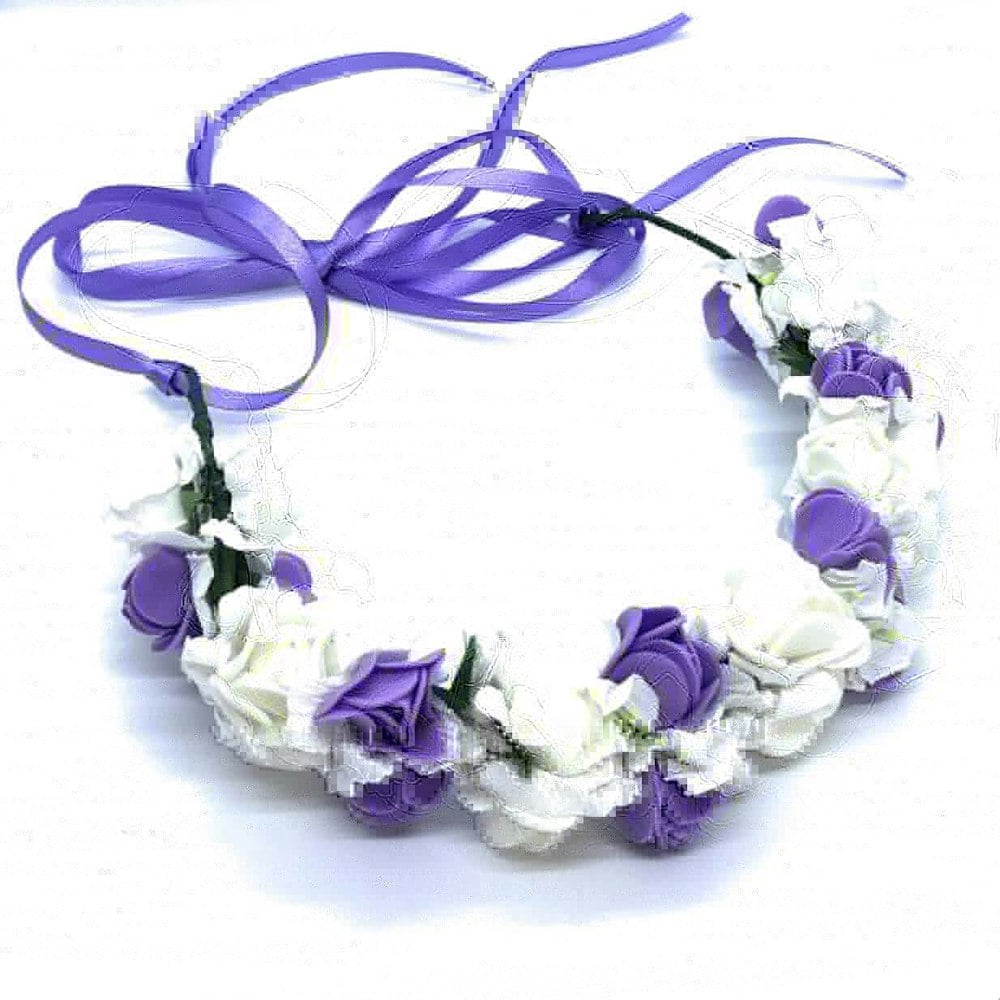 A wide 3/4 flower headband with lots of pretty ivory and lilac rosettes, attached to a soft covered green wire which can be twisted to fit.