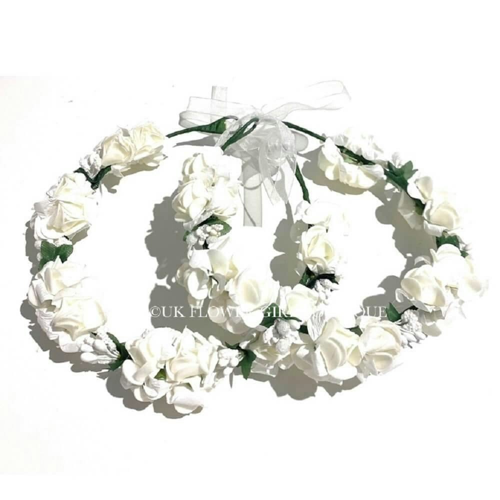 A wide flower headband with lots of pretty white rosettes, attached to a soft covered green wire which can be twisted to fit.