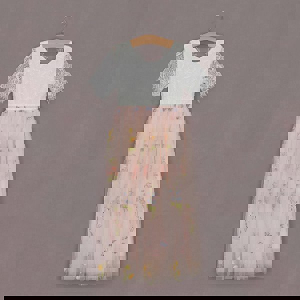 Our enchanting lace and tulle with our newest patterned lace is a perfect flower girl dress. It is made with a delicate floral patterned off-white coloured lace bodice, with a matching embroidered soft baby pink tulle skirt.