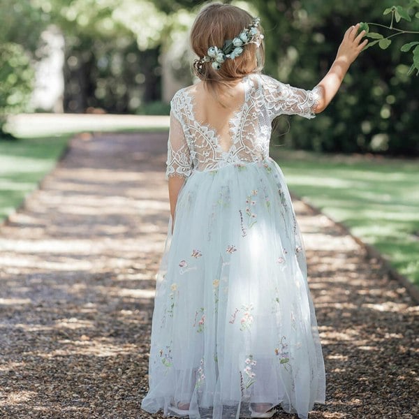 Our enchanting lace and tulle with a new patterned lace is a perfect flower girl dress. It is made with a delicate floral patterned powder blue coloured lace bodice, with matching embroidered tulle skirt.