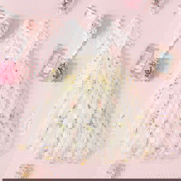 Our enchanting lace and tulle with our newest patterned lace is a perfect flower girl dress. It is made with a delicate floral patterned off-white coloured lace bodice, with a matching embroidered gentle ivory cream tulle skirt.