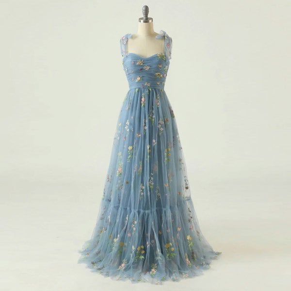 Stunning bridesmaid or prom dress with embroidered fabrics that perfectly complement the younger flower girls' range. Featuring a ruched bodice and a long, flowy lined skirt. Zip rear closure.