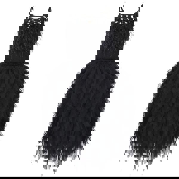The black layered skirt is stitched with ruffles running top to bottom, all the way round creating a mass volume effect tutu.