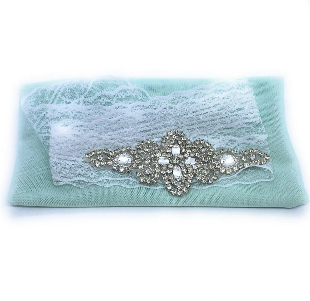 Pretty lace ribbon with affixed Diamanté brooch. Simply wrap around dress and tie to rear.