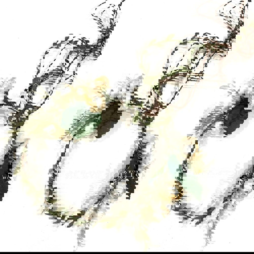 A gypsy style floral headband with lots of pretty metallic ivory and white rosebuds. The style is worn with the flowers either side of the head, with the delicate rosettes and trailing ribbons that tie to the rear and fall down the neck. The attached small pretty leaves give a very rustic bohemian look to the garland.