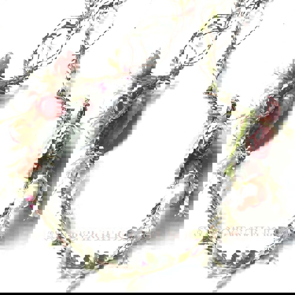 A gypsy style floral headband with lots of pretty metallic pink and ivory white rosebuds. The style is worn with the flowers either side of the head, with the delicate rosettes and trailing ribbons that tie to the rear and fall down the neck. The attached small pretty leaves give a very rustic bohemian look to the garland.