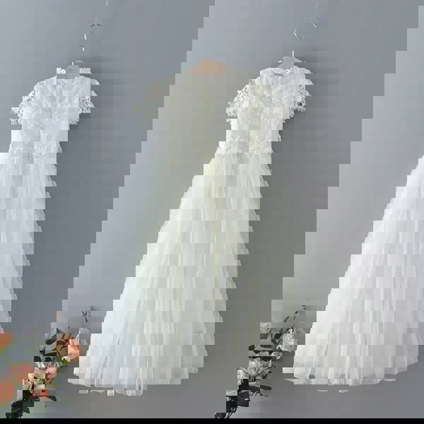 This beautiful Ivory Cream flower girl dress has one of the prettiest bodices we stock. The intricate detailing across the shoulders really makes this dress a stand out unique style. Pretty cap sleeves and a rear zip closure.