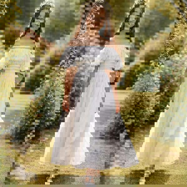 At the back, a delicate open-back detail is finished with an oversized statement bow, adding a whimsical, heirloom touch while allowing adjustability and comfort. The gathered waist continues through the back, ensuring the dress is as practical as it is beautiful.