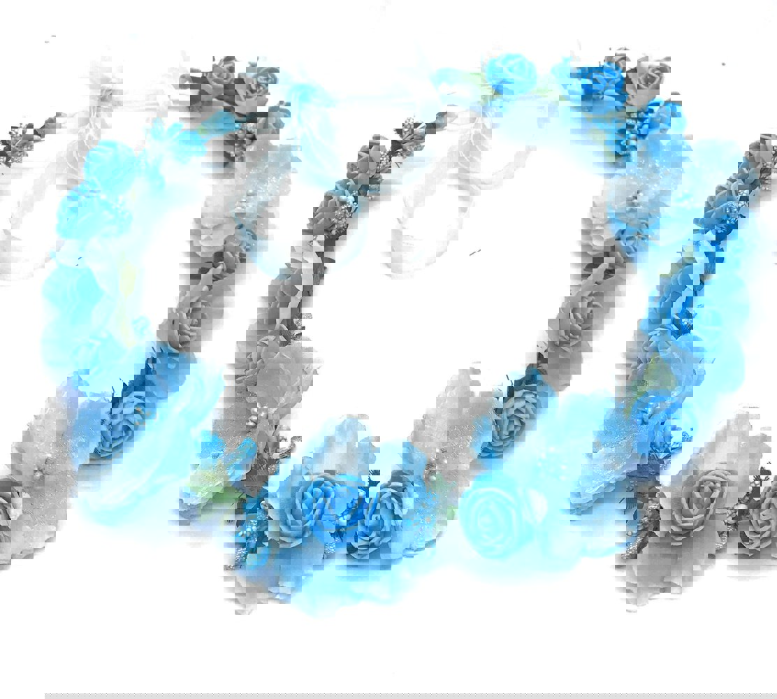 Pretty blue small rosettes mixed with larger style faux flowers, attached to a soft covered wire which can be twisted to fit.