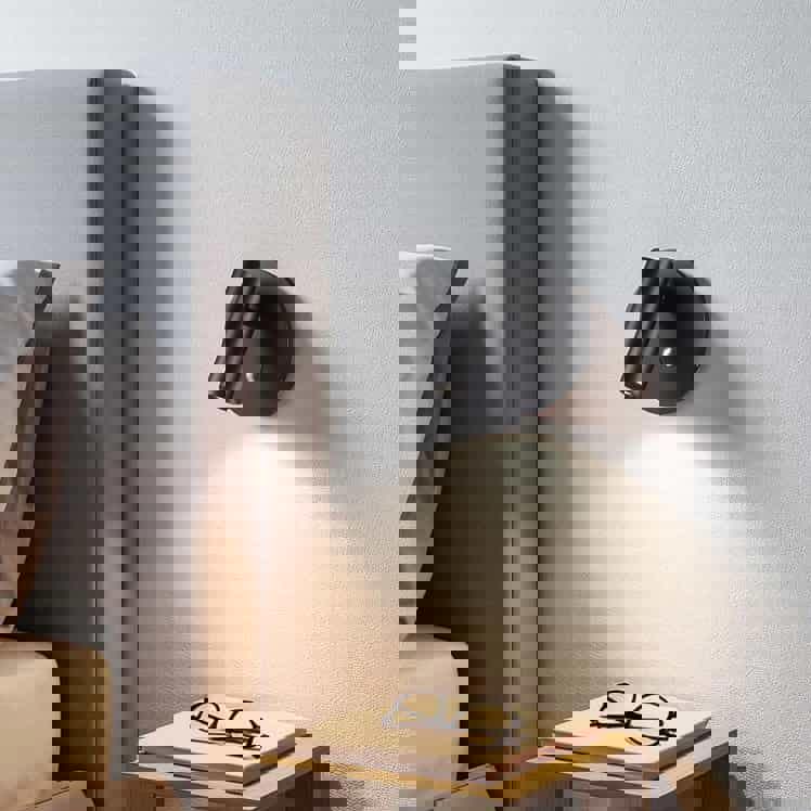 A sleek recessed bed reading light with an adjustable tilting head for directional control. Features a 3-watt CREE LED in black finish, requiring an 82mm hole cutout and 240V wiring. Ideal for bedside reading in homes or hotels.