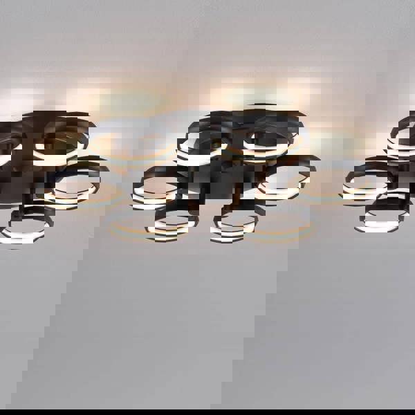 This striking large flush ceiling light combines form and function with its distinctive six-ring design, each featuring an acrylic diffuser that disperses 3600 lumens of warm 3000K light throughout your space.