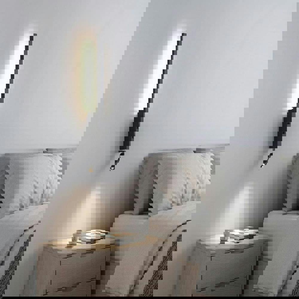 This bedside light with reading light features a main light that shines back on the wall behind it as well as a smaller pen-style adjustable reading light that you can use to direct a beam in one specific place. The individual on/off switches allows you to control both of them easily.