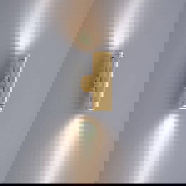 This brass exterior wall light is cylindrical in shape and features two, 3 watt integrated LED's on either end that shine a light both up and down the wall. The result is a wall wash effect that makes it every bit as decorative as it is practical. The brass finish of the up and down outside wall light gives it a luxurious finishing touch that modernises the exterior straight away.