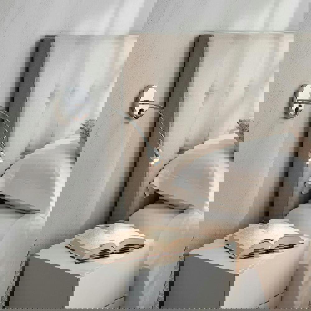 The Asti 3 watt switched LED wall mounted flexible reading light is perfect for people who enjoy reading in bed. This light has a polished chrome back plate that is surface mounted with a flexible aluminium arm that can be adjusted.