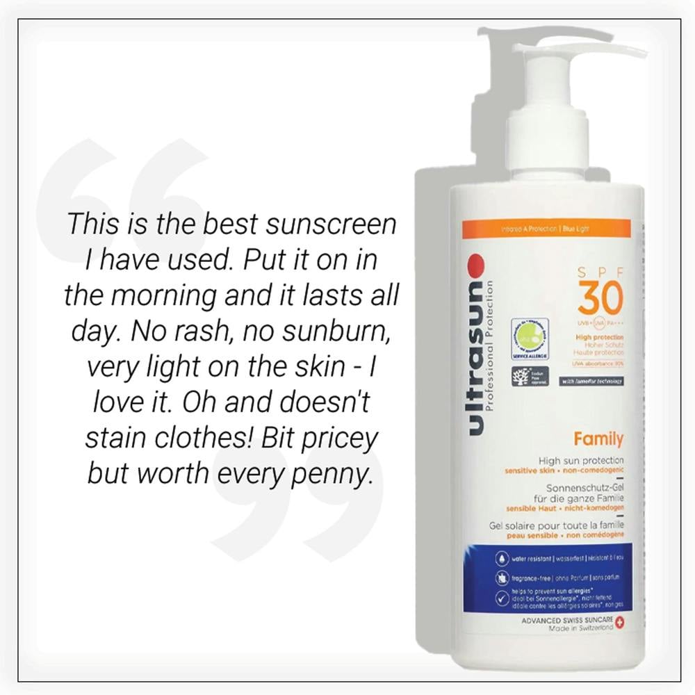 UltraSun's Super Sensitive Family SPF30 is free from oils, emulsifiers and perfume reducing the risk of allergy and making it especially suitable for sensitive skins. Like other ultrasun products, it is non-greasy, water-resistant and easy to use