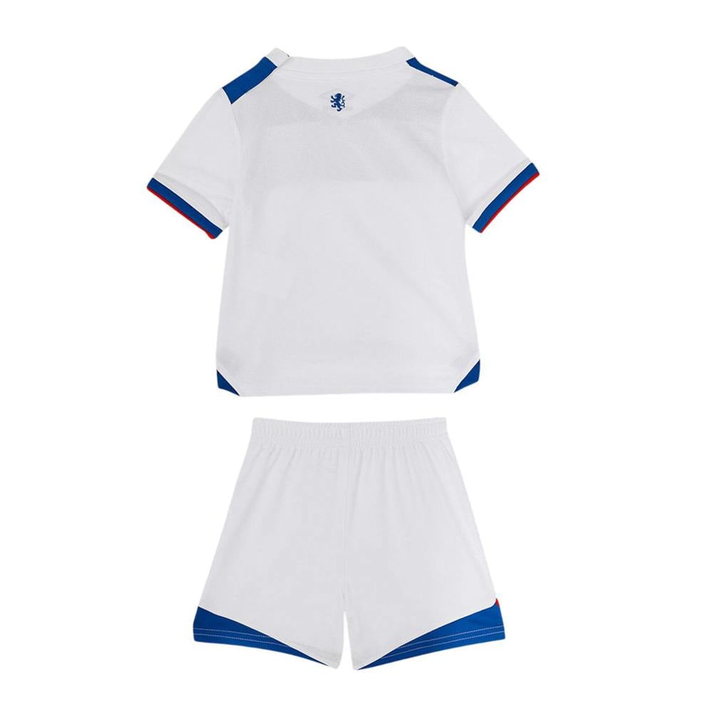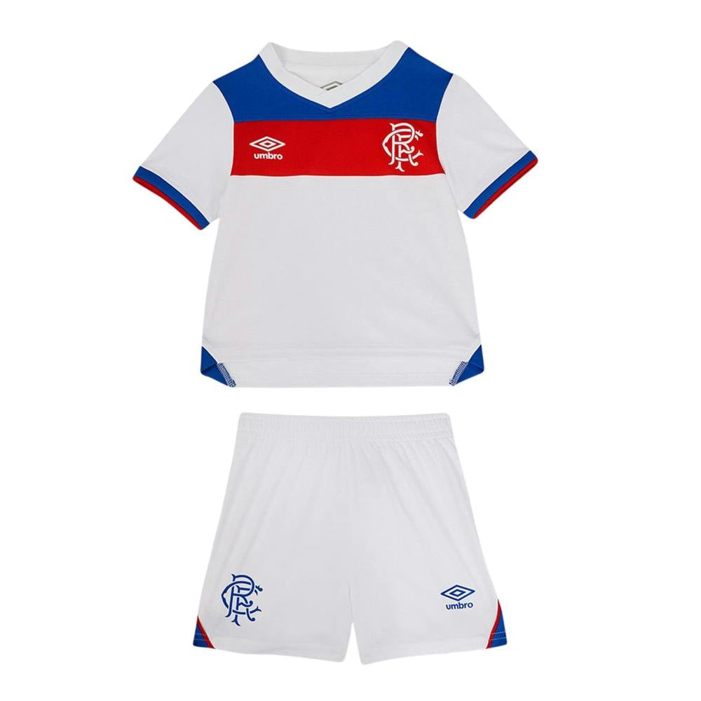 This Umbro baby 25/26 Rangers FC away kit comes in Brilliant White with Lapis Blue and Flame Scarlet details. The set includes a short-sleeved jersey with a V neck and contrast panels, finished with a logo. Matching shorts have an elasticated waistline and a pull-on fastening for simple dressing.