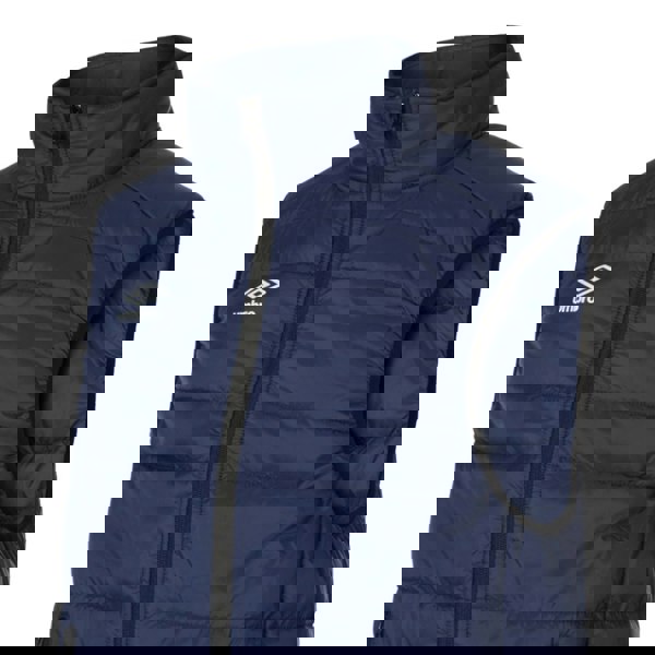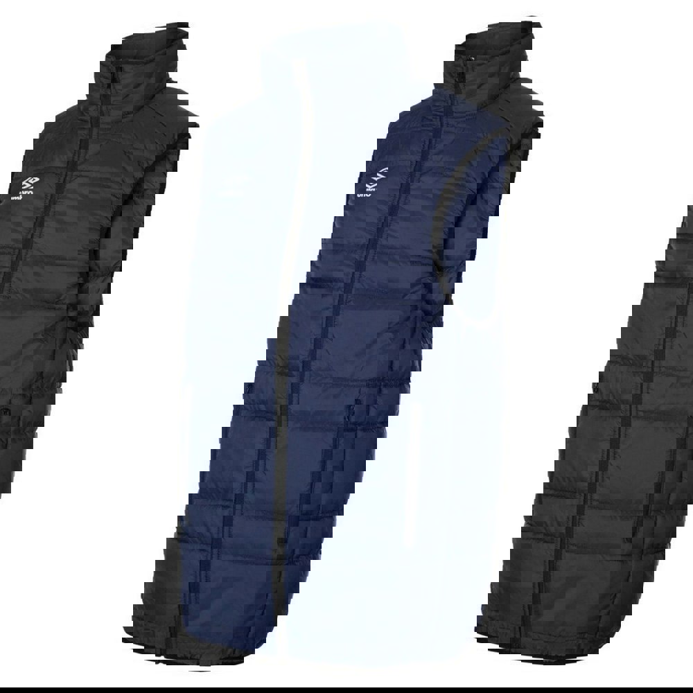 This children’s gilet from Umbro comes in dark navy and white with a quilted stacked rock design. The outer is made from 100% nylon with a polyester filling, and the padded construction is finished with a contrast placket. A standing collar and sleeveless cut keep the shape clean and simple.