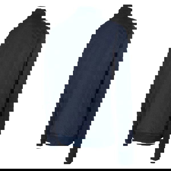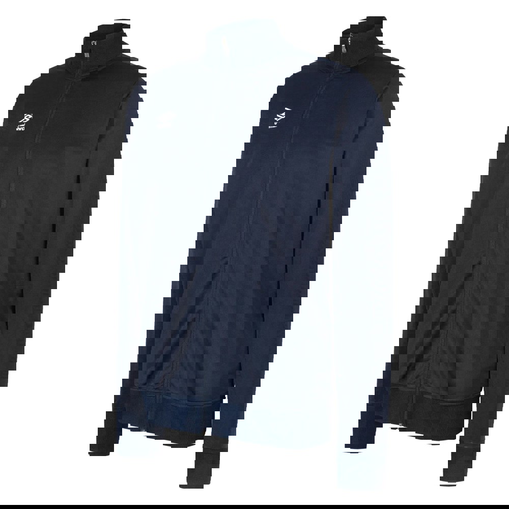 This children’s jacket from Umbro comes in dark navy with a stacked logo design. Made from 100% polyester, it has long sleeves and a standing ribbed collar for a clean, sporty look. A full zip fastening runs through the front, with a zip detail also noted on the pockets.