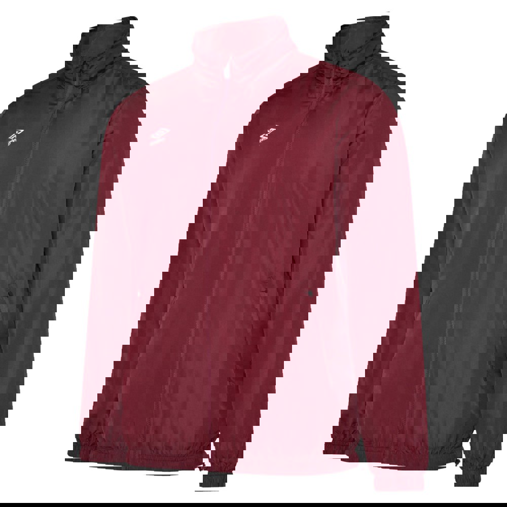 Umbro Club Essential light waterproof jacket in New Claret. Made from 100% polyester with a mesh lining, this lightweight layer has a hooded neckline with a standing collar. The hood sits concealed for a clean finish, while long sleeves and an elasticated hem complete the shape.