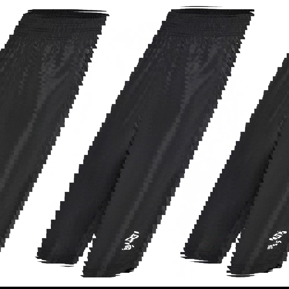 These Umbro Club Essential training shorts for children are made from 100% polyester and come in black. The design combines a diamond pattern with a logo detail for a clean, sporty look. An elasticated waist with a DTM drawcord provides an adjustable fit, while two side pockets add practical storage.