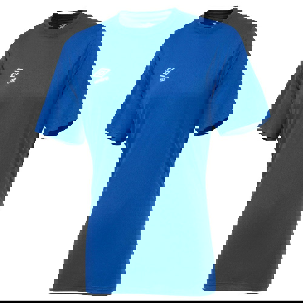This children’s Umbro Club Jersey comes in royal blue with a stacked logo design. Made from 100% polyester micro eyelet fabric, it has a ribbed crew neckline and short sleeves for a clean, classic finish.