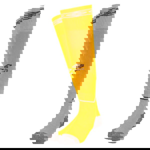 Umbro Childrens/Kids Diamond Football Socks in amber and black are made from a polyamide, cotton and elastane blend with a micro mesh fabric. The design includes contrast detailing and a logo, finished with a ribbed ankle and a turnover, elasticated cuff.