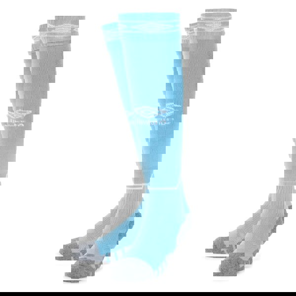 These Umbro childrens diamond football socks come in sky blue and white with a contrast design and Umbro logo. Made from micro mesh fabric, they combine polyamide, cotton and elastane for a close, flexible fit. The construction includes an elasticated foot and elasticated ankles, finished with a ribbed ankle section for a secure feel.
