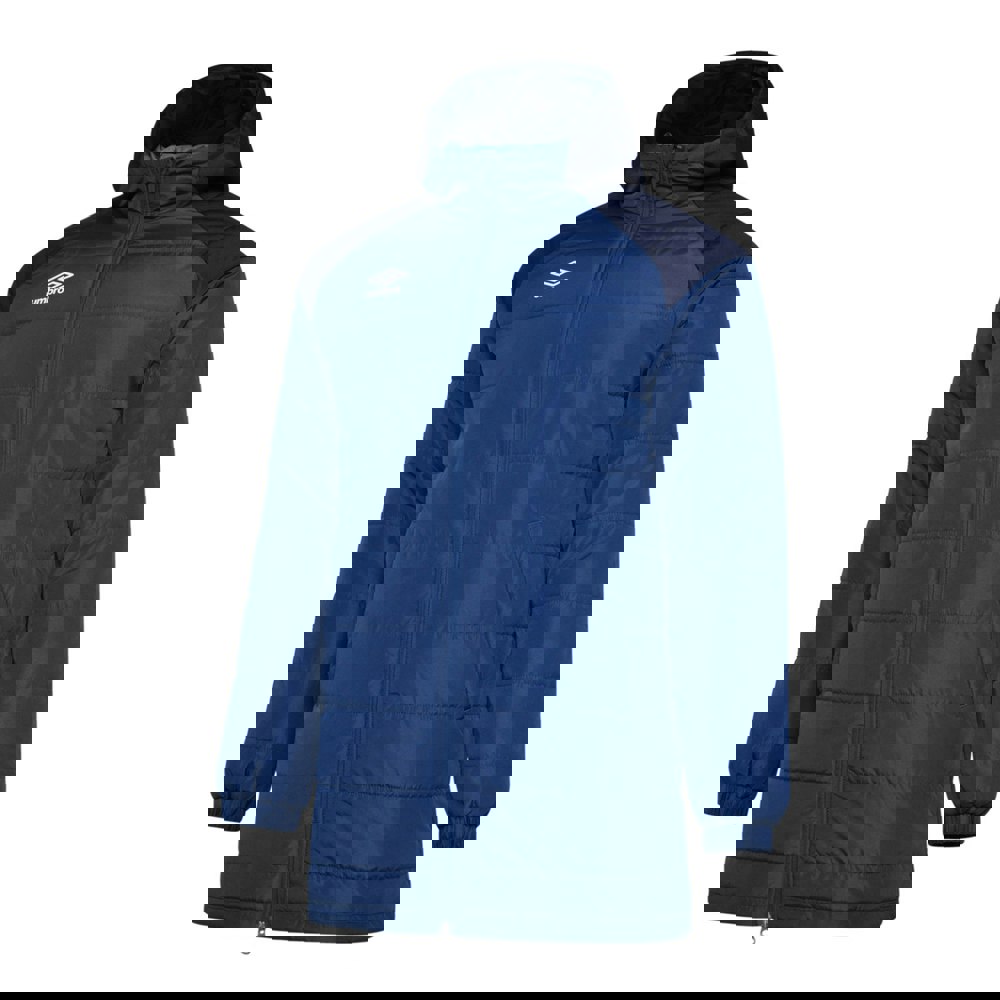 This children’s padded jacket from Umbro comes in navy/peacoat with a quilted finish and contrast shoulders. Made from 100% polyester with a PU coating, it has a hooded neckline with a standing collar and a grown-on hood for a clean, integrated look.