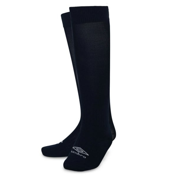 Umbro Primo football socks for children and kids in dark navy and white. Made from a nylon and elastane blend, they have an elasticated construction and a ribbed ankle. A logo detail completes the design.