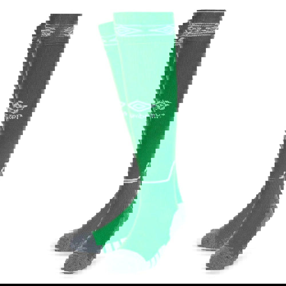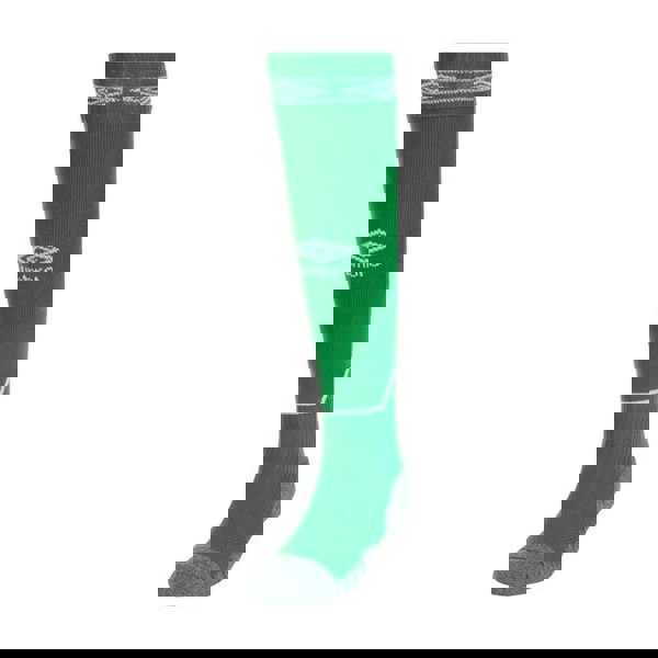 Umbro Diamond football socks in emerald and white with a knee-high cut. The fabric combines intarsia and micro mesh, with contrast detailing and a logo for a clean, sport-led finish. An elasticated foot helps keep the sock in place, while the turnover cuff sits neatly at the top.