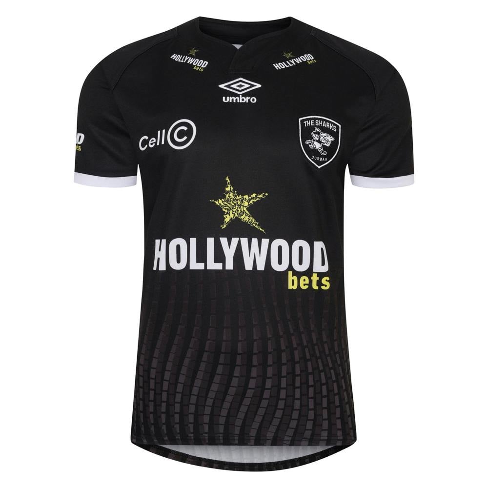 The Umbro Kids 23/24 Sharks Replica Home Jersey comes in black with a short-sleeved cut and a V neck. The design combines a crest with embroidered and printed details, alongside a logo. Made from 100% polyester, this replica jersey uses durable fabric technology and is 100% officially licensed.