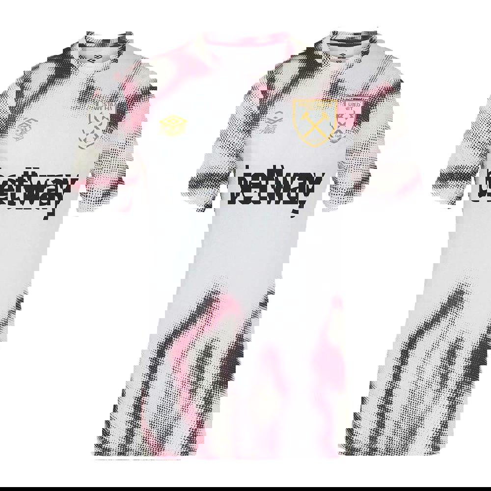 This kids’ 24/25 West Ham United FC warm up jersey from Umbro comes in Brilliant White with New Claret and Cerulean detailing. It is made from 100% polyester and uses a knitted mesh micro eyelet fabric construction. The hem is dropped for a defined finish. Officially licensed, it carries authentic club branding for the 24/25 season.